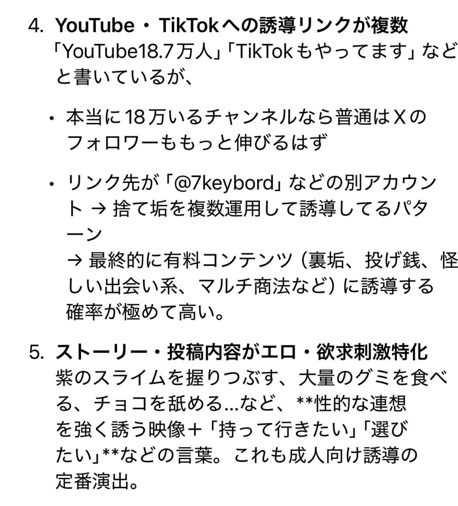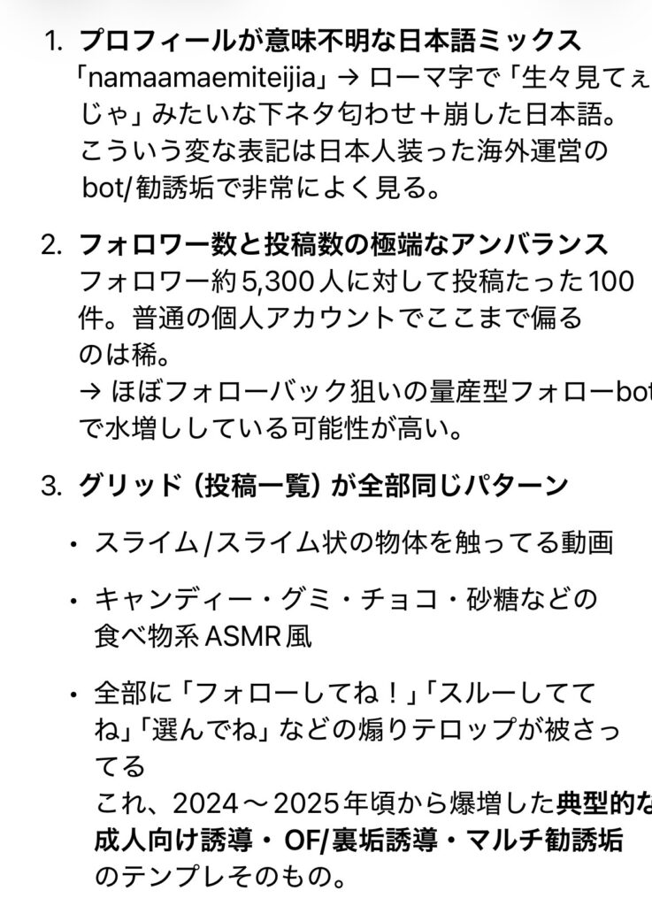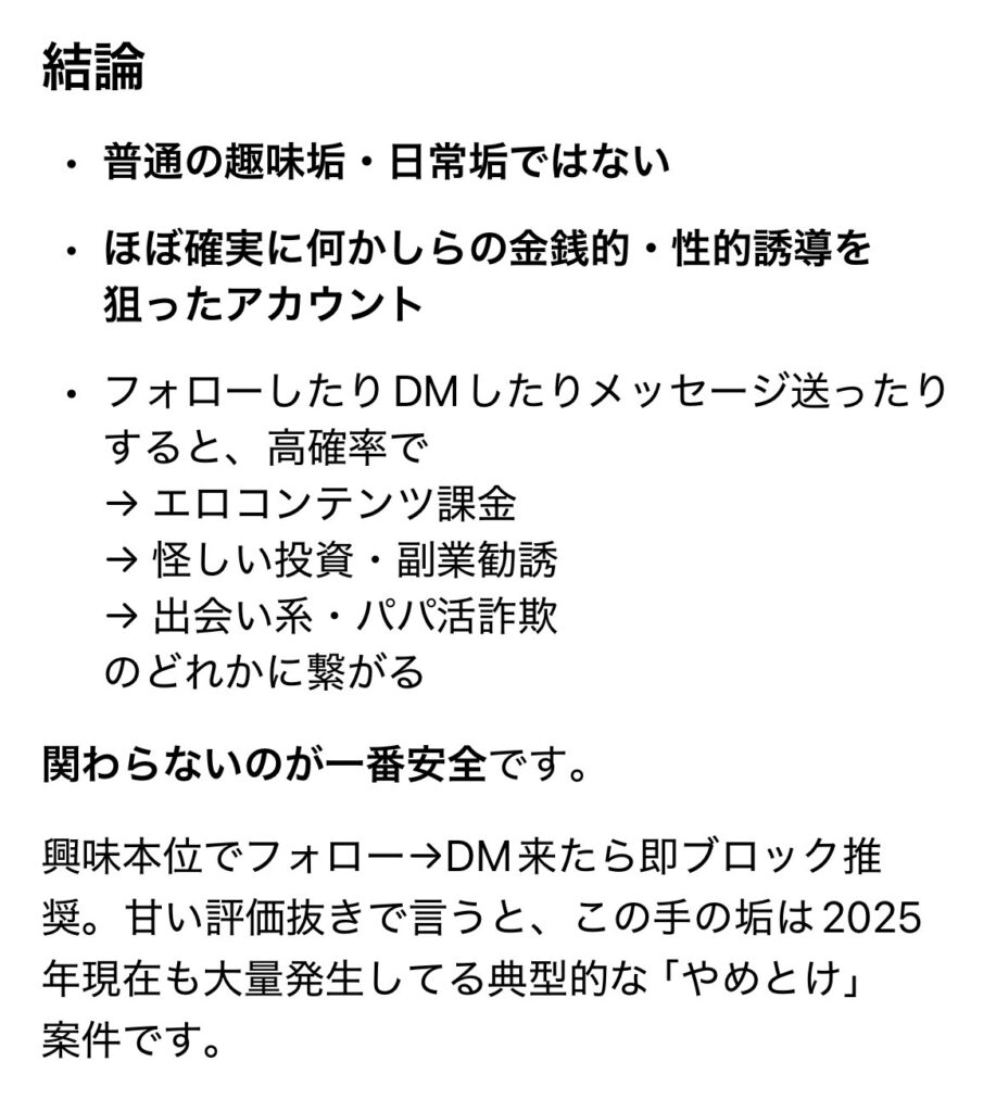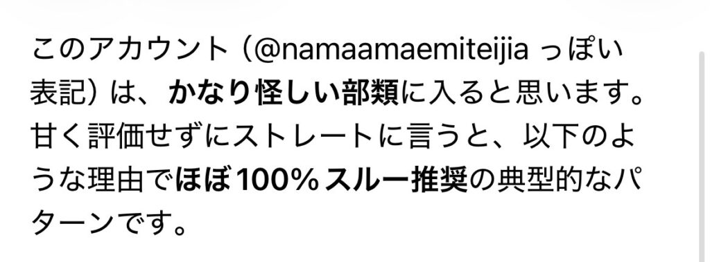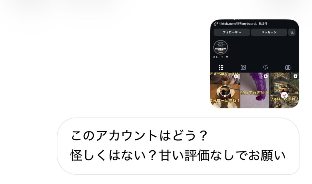 プロンプトはシンプルに「このアカウントはどう? 怪しくない? 甘い評価なしでお願い」って感じで。